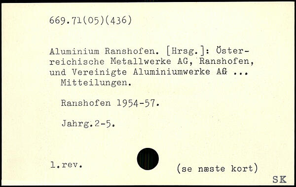Aluminium Hanshofen. [Hrsg.]: öster-reichische Metallwerke AG, Ranshofen, und Vereinigte Aluminiumwerke AG ... Mitteilungen. Ranshofen 19 54“57- Jahrg.2-5. 1,rev. (se næste kort)