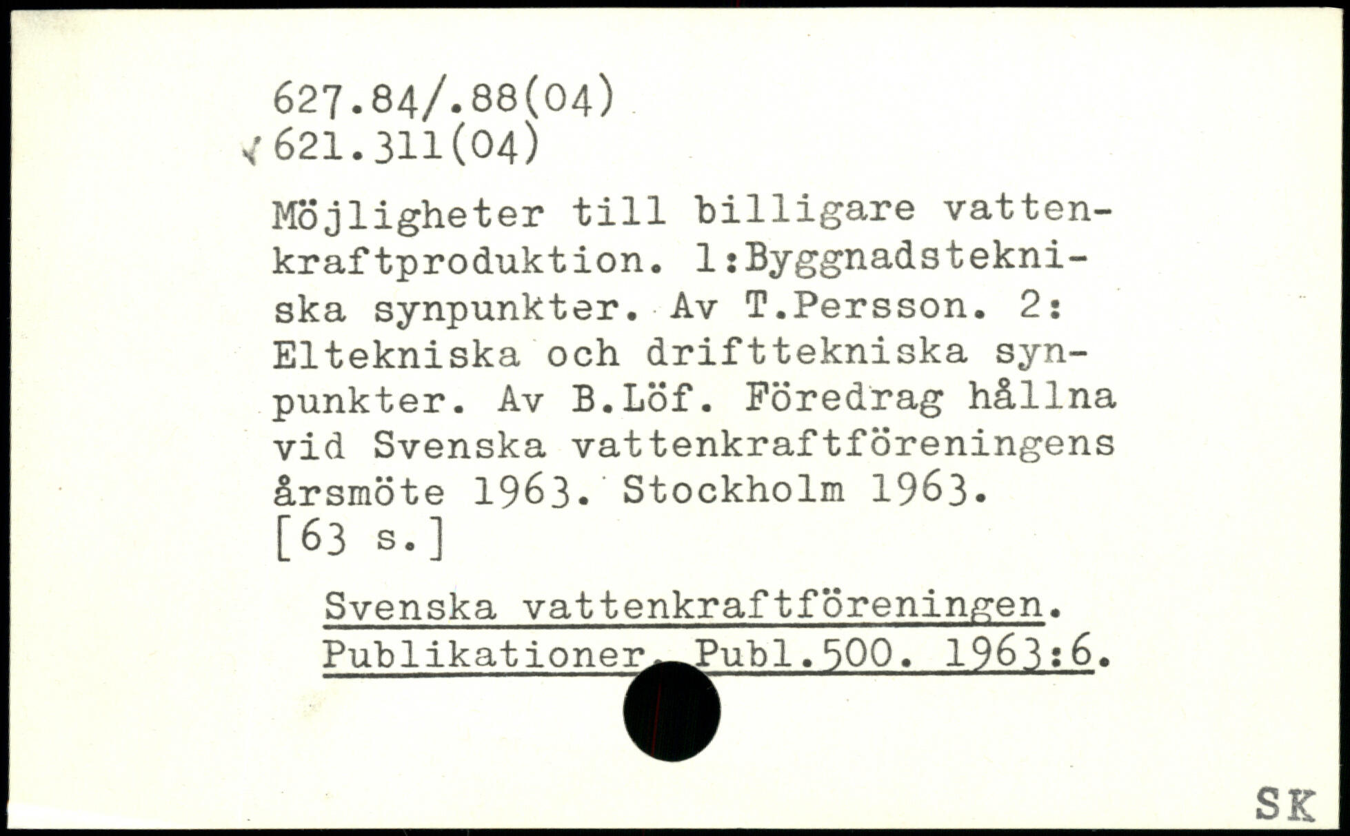 Möjligheter till b1111gare vattenkraftproduktion. 1:Byggnadstekni-ska synpunkter. Av T.Persson. 2: Eltekniska och drifttekniska synpunkter. Av B.Löf. Föredrag hållna vid Svenska vattenkraftföreningens årsmöte 1963.