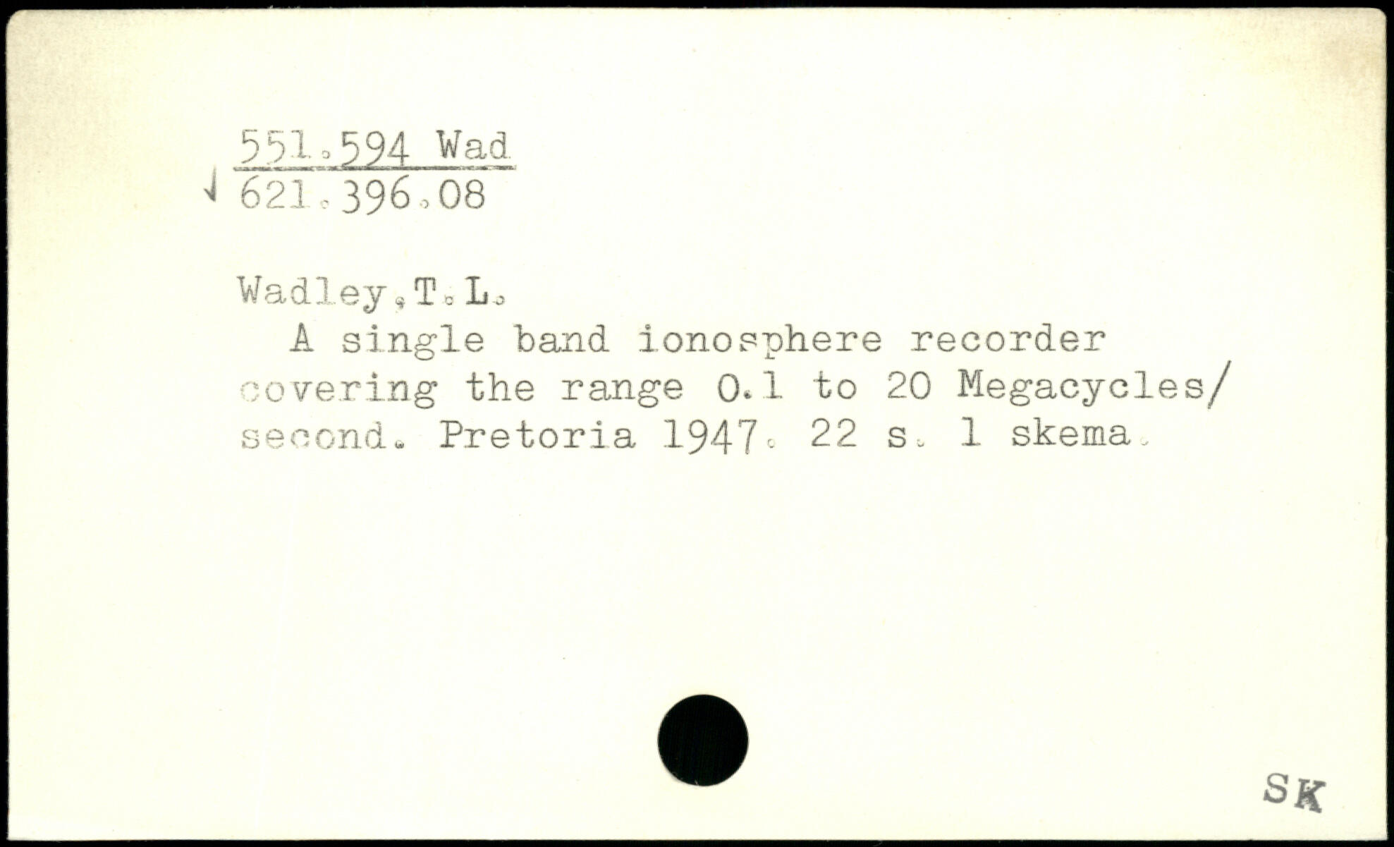 A single band ionosphere recorder covering the range 0.1 to 20 Megacycles/ second, Pretoria 1947^