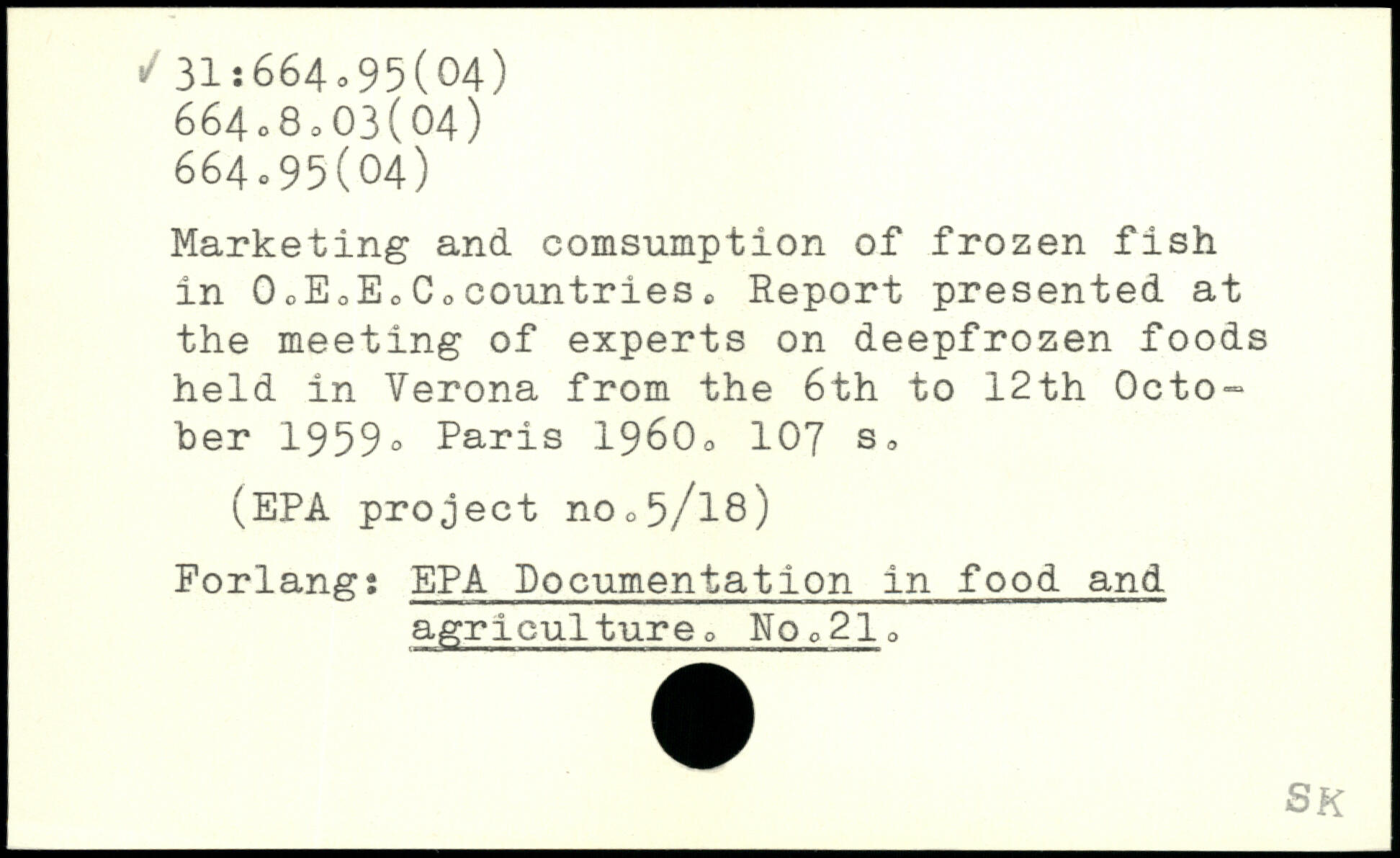 Marketing and comsumption of frozen fish in 0oEoEoCoCOuntriesc Report presented at the meeting of experts on deepfrozen foods held in Verona from the 6th to 12th October 1959.