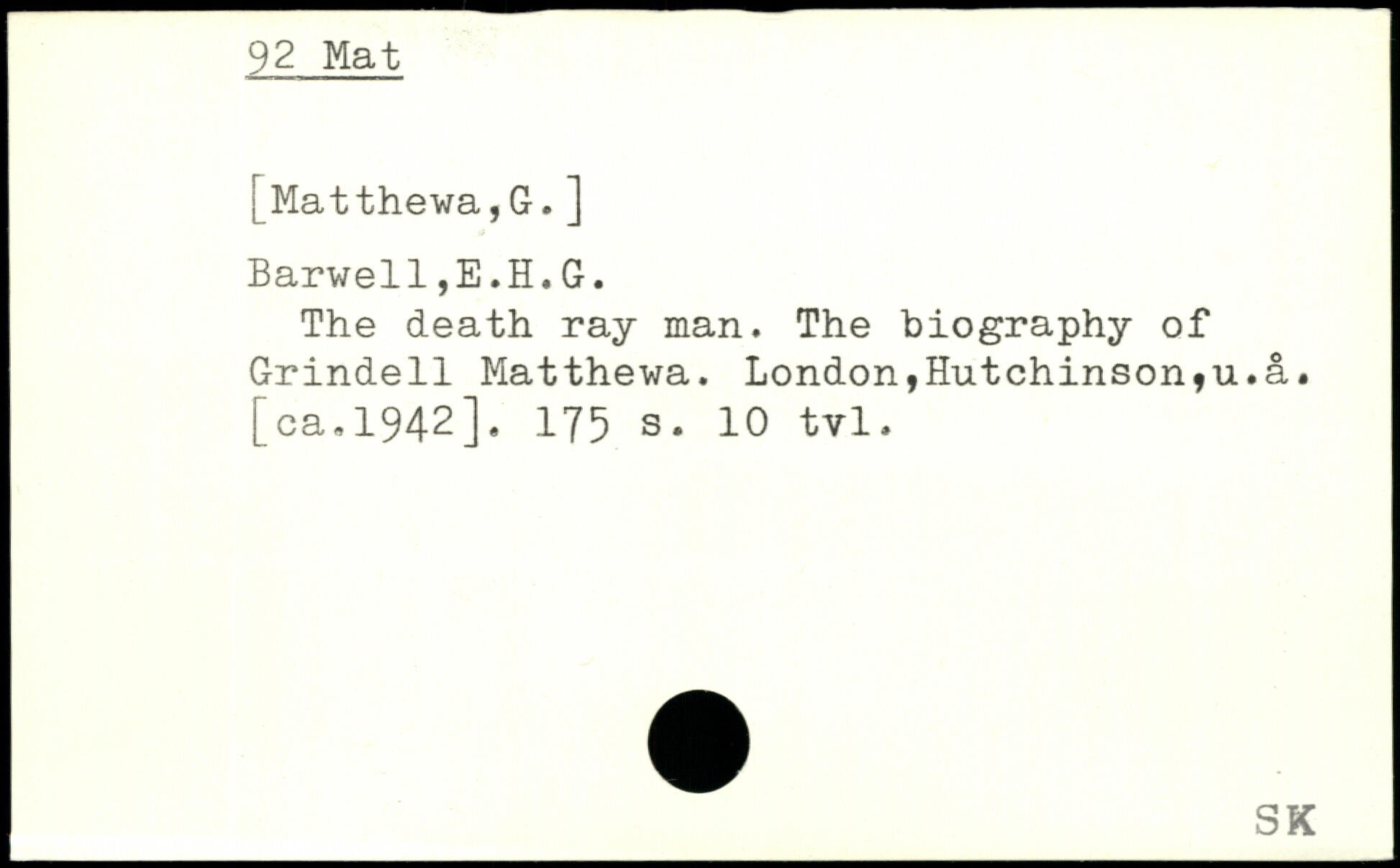 The death ray man. The biography of Grindeil Matthewa. London,Hutchinson,u.a. [ca, 1942].
