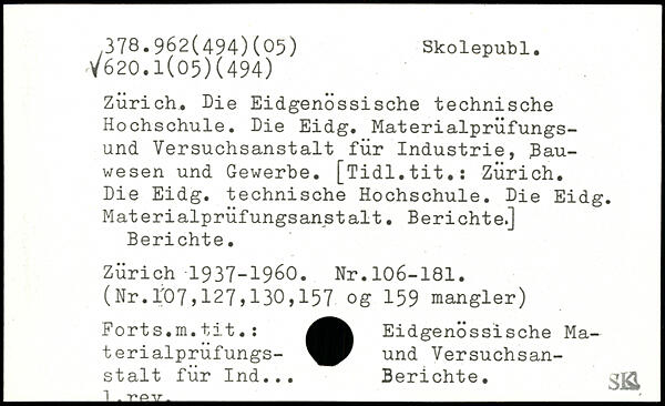 Zürich., hie Eidgenössische technische Hochschule, hie Eidg. Materialprüfungsund Versuchsanstalt für Industrie, Bauwesen und Gewerbe. [Tidl.tit.s Zürich, hie Eidg. technische Hochschule, hie Eidg. Materialprüfungsanstalt. Berichte.] Berichte. Zürich 1937-1960. Nr.106-181.