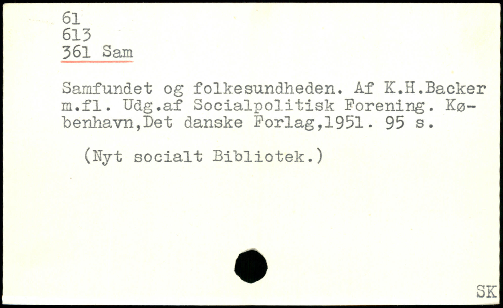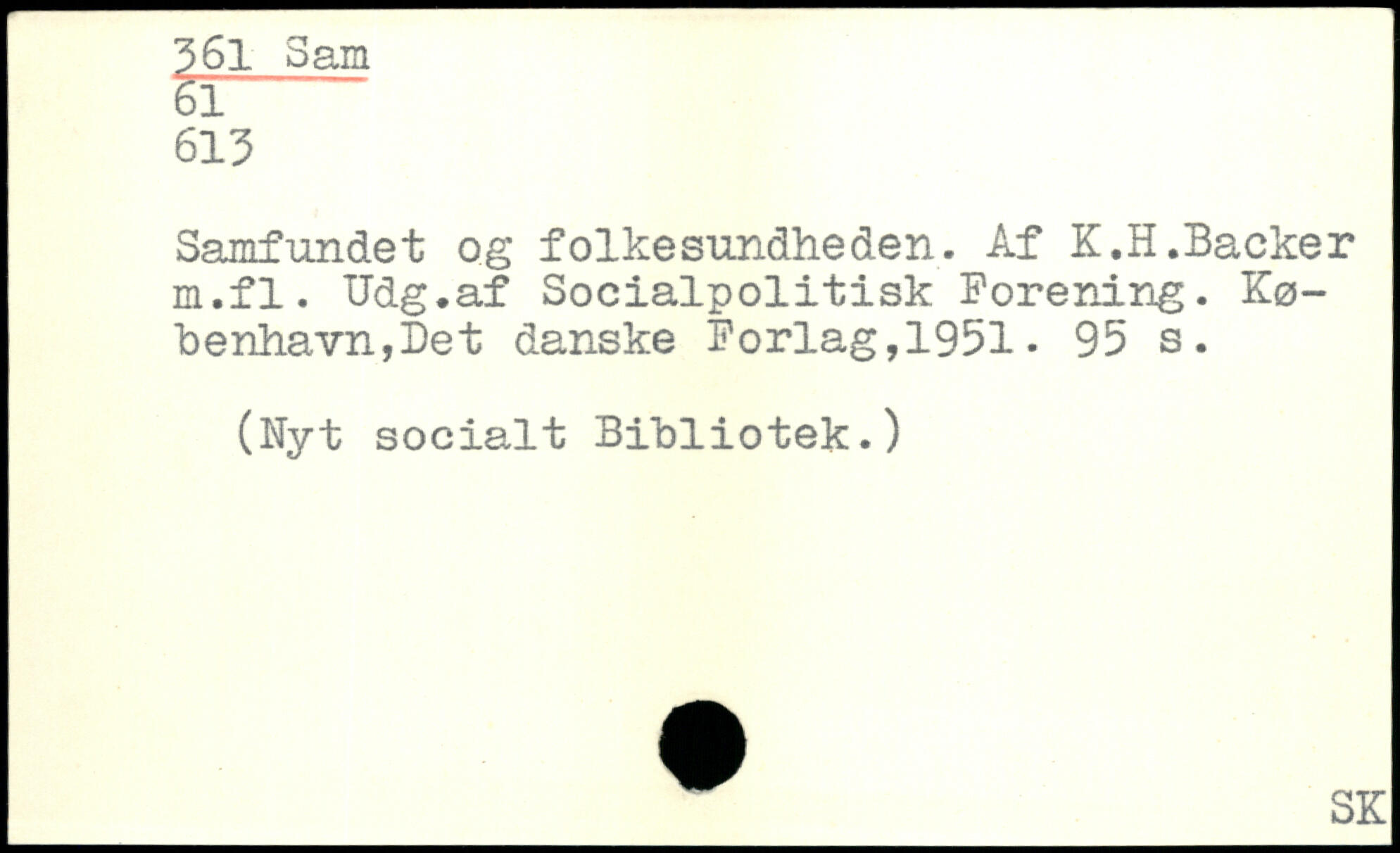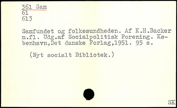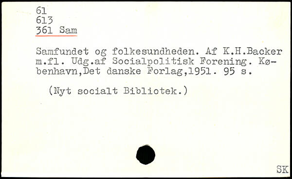 Samfundet og folkesundheden. Åf K.H.Backer m.fl. Udg.af Socialpolitisk Forening.