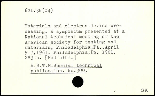 Materials and electron device processing. A symposium presented at a National technical meeting of the American society for testing and materials, Philadelphia,Pa.,April 5-7,1961. Philadelphia,Pa. 1961.