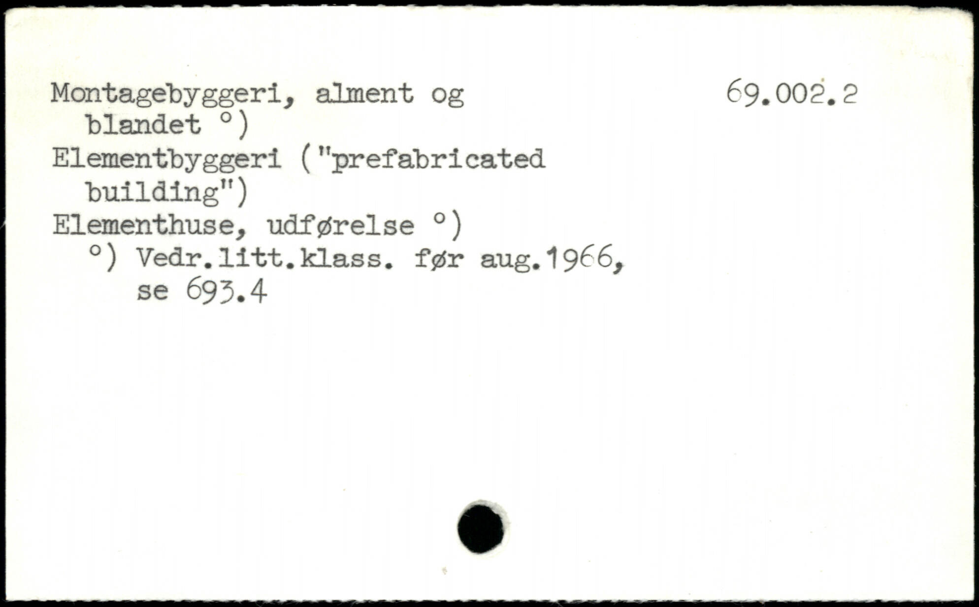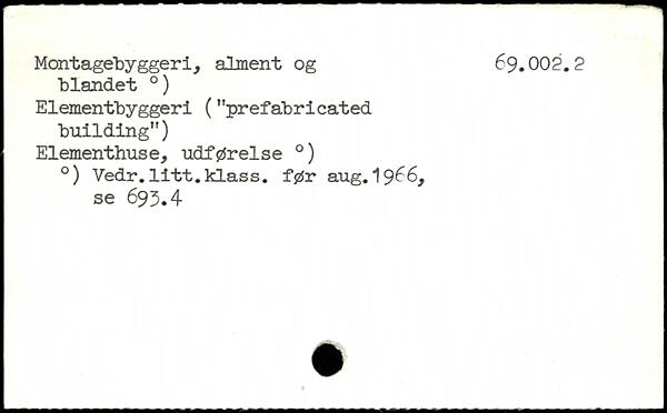 Montagebyggeri, alment og 69.002.2 blandet 0) Elementbyggeri ("prefabricated building") Elementhuse, udførelse .) .) Vedr.litt.klass. før aug. 1966, se 693.4