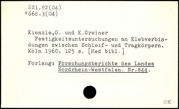 Kienzle,0, und K.Greiner Festigkeitsuntersuchungen an Klebverbindungen zwischen Schleif- und Tragkörpern.