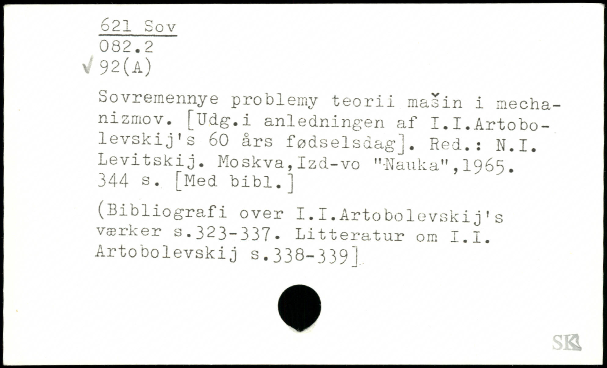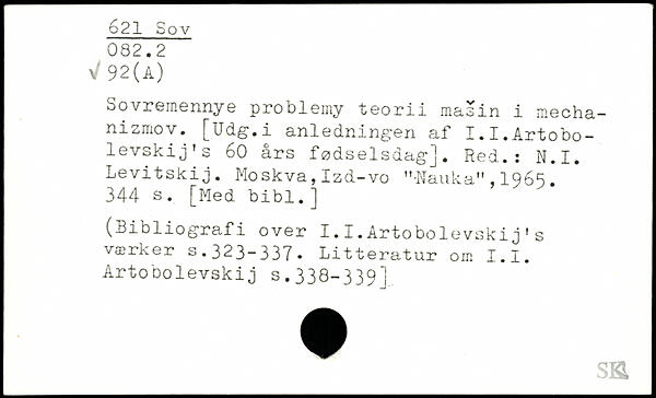 Sovremennye problemy teorii masin i mecha-nizmov. [Udg.i anledningen af I.I.Artobolevski j' s 60 års fødselsdag]. Red.: N.I. Levitskij. Moskva, Izd-vo "-Nauka" , 1965.