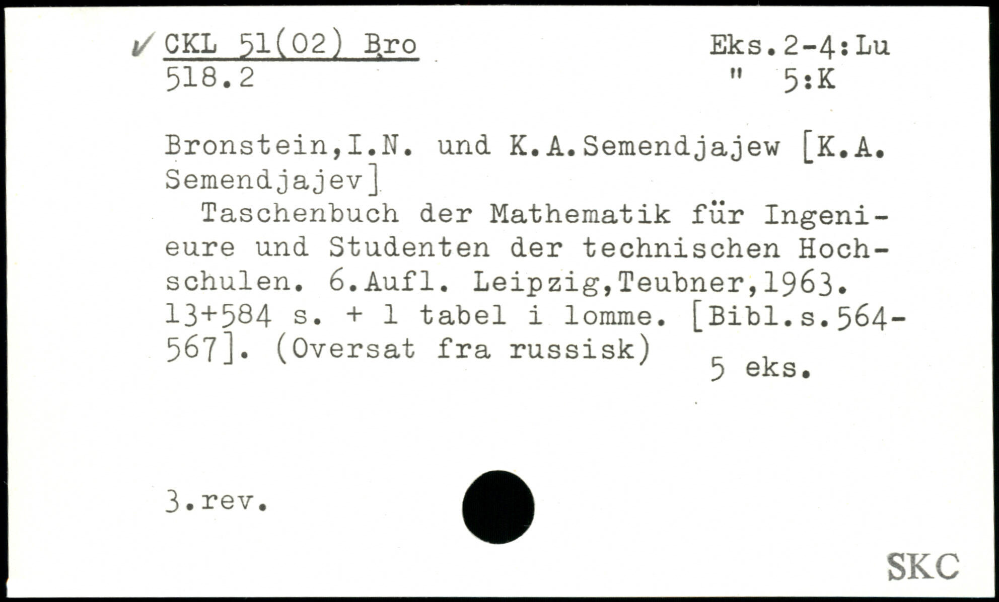 Bronstein,I.N. und K.A.Semendjajew [K.A. Semendjajev] ; Taschenbuch der Mathematik für Ingenieure und Studenten der technischen Hochschulen. é.Aufl.