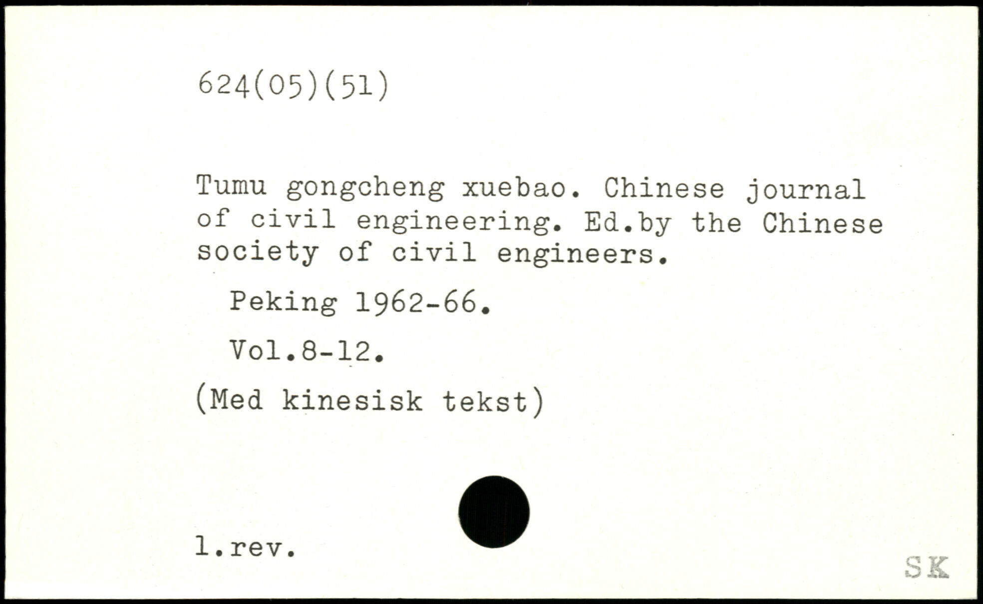 Tumu gongcheng xuebao. Chinese journal of civil engineering. Ed.by the Chinese society of civil engineers. Peking 1962-66.
