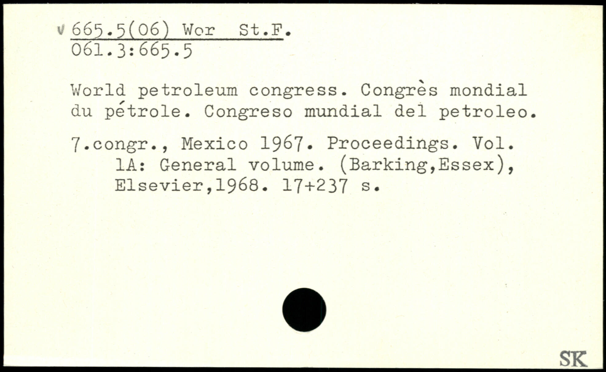 World petroleum congress. Congrès mondial du pétrole. Congreso mundial del petroleo. 7-congr., Mexico 1967. Proceedings. Vol. 1A: General volume. (Barking,Essex), Elsevier,1968.