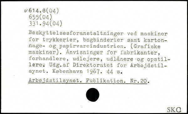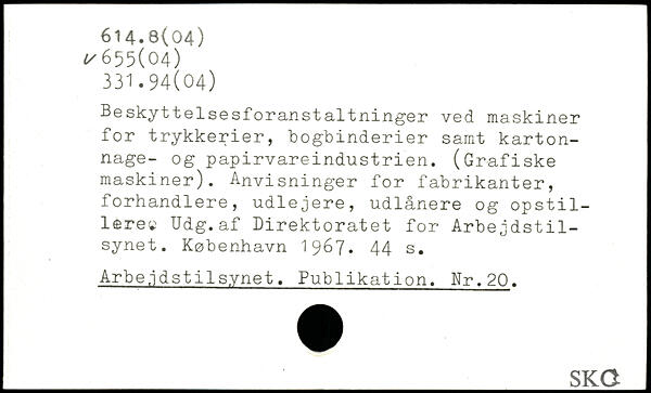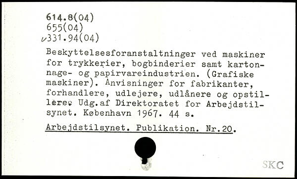 Beskyttelsesforanstaltninger ved maskiner for trykkerier, bogbinderier samt kartonnage- og papirvareindustrien. (Grafiske maskiner). Anvisninger for fabrikanter, forhandlere, udlejere, udlånere og opstilleres Udg.af Direktoratet for Arbejdstilsynet.