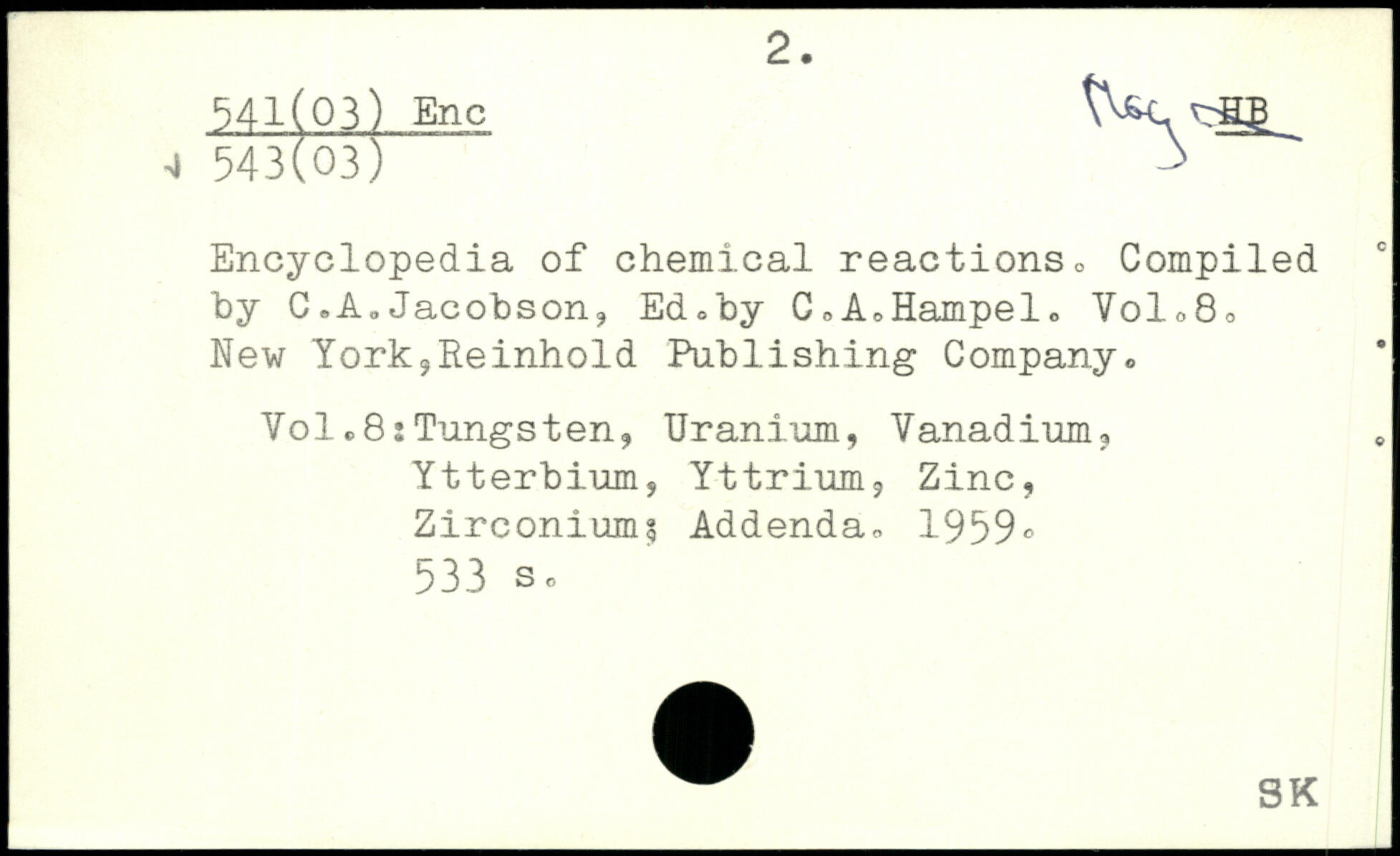 Encyclopedia of chemical reactions. Compiled hy C.A.Jacobson, Edoby CoAoHampel, V01080 New York?Reinhold Publishing Company, Yol,8;Tungsten, Uranium, Vanadium, Ytterbium, Yttrium, Zinc, Zirconium? Addenda, 1959.