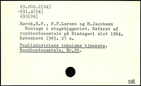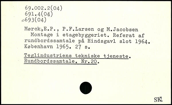 Mørck:,E.P. , P.F.Larsen og M. Jacobsen Montage i etagebyggeriet. Referat af rundbordssamtale på Hindsgavl slot 1964.