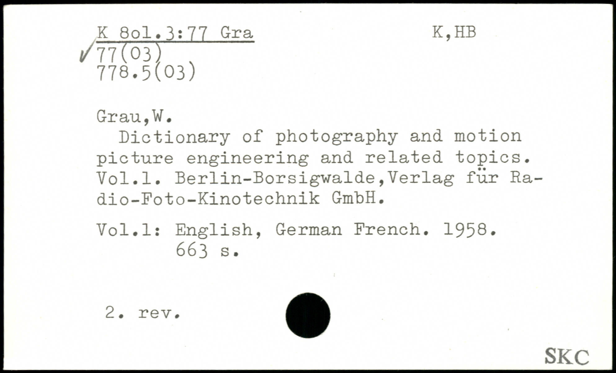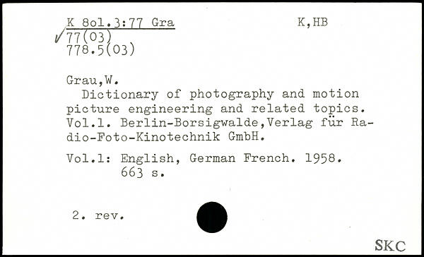 Dictionary of photography and motion picture engineering and related topics. Yol.l. Berlin-Borsigwalde,Verlag fur Ra-dio-Foto-Kinotechnik GmbH. Vol.l: English, German French. 1958.