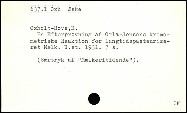 En Efterprøvning af Orla-Jensens kremo-metriske Reaktion for langtidspasteurise-ret Mælk. U.st. 1931.