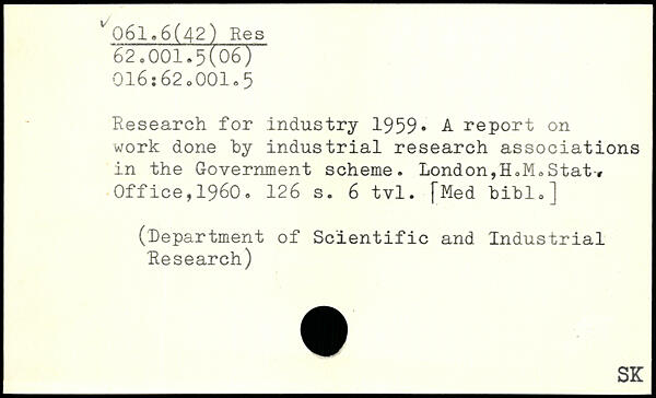 Research for industry 1959. A report on work done by industrial research associations in the Government scheme. London,H.M.Stat-. Office,1960.