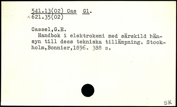 Cassel,G,.E. Handbok i elektrokemi med särskild hänsyn till dess tekniska tillämpning,