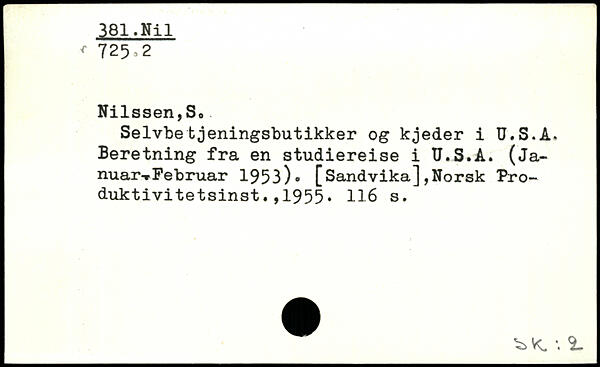 Selvbetjeningsbutikker og kjeder i U.S.A. Beretning fra en studiereise i U.S.A. (Januar -,Februar 1953)® [Sandvika],Norsk Pro-duktivitetsinst.,1955.