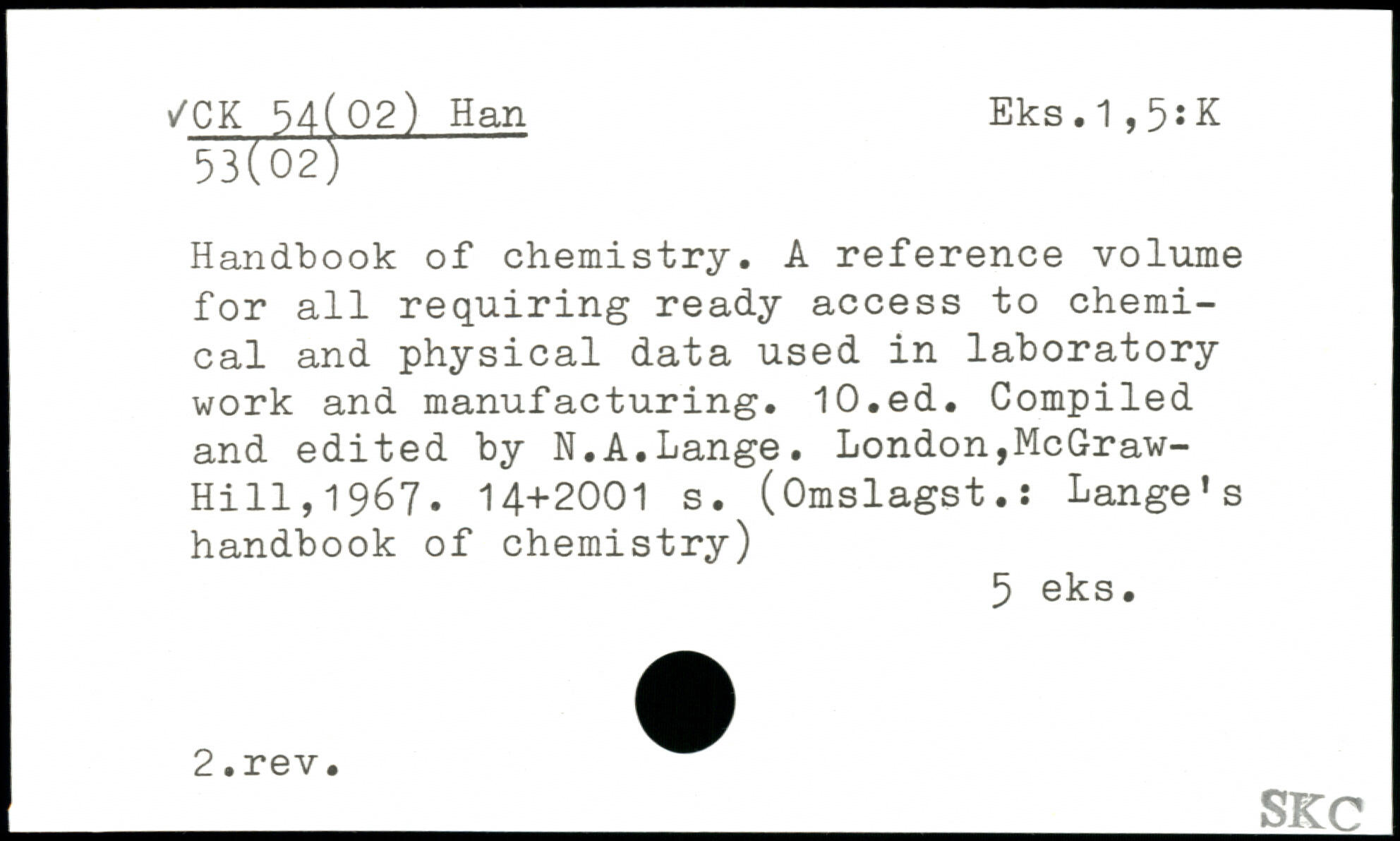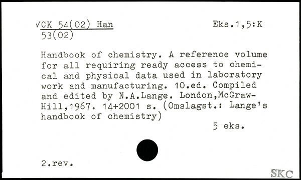 Handbook of chemistry. A reference volume for all requiring ready access to chemical and physical data used in laboratory work and manufacturing.