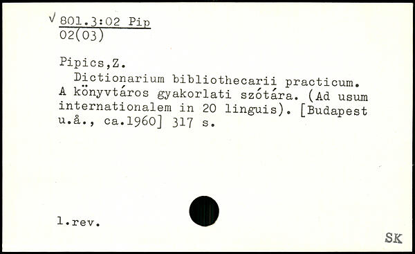 Dictionariurn bibliothecarii practicum, A könyvtaros gyakorlati szotara. (Ad usum internationalem in 20 linguis). [Budapest u.å., ca.1960]
