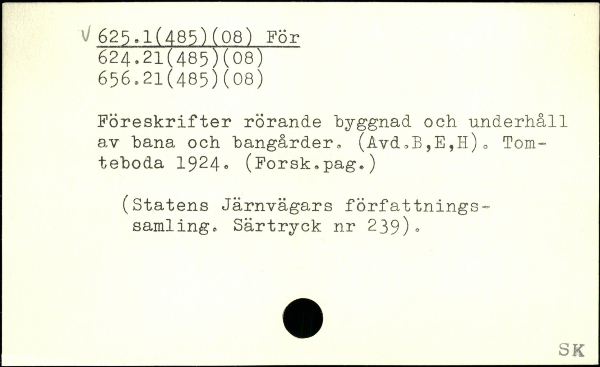 Föreskrifter rörande byggnad och underhåll av bana och bangårder, (Avd,B,E,H), Tomteboda 1924, (Forsk.pag.) (Statens Järnvägars författnings-samling. Särtryck nr 239)