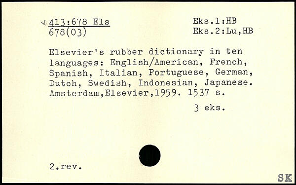 Elsevier's rubber dictionary in ten languages: English/American, French, Spanish, Italian, Portuguese, German, Dutch, Swedish, Indonesian, Japanese.