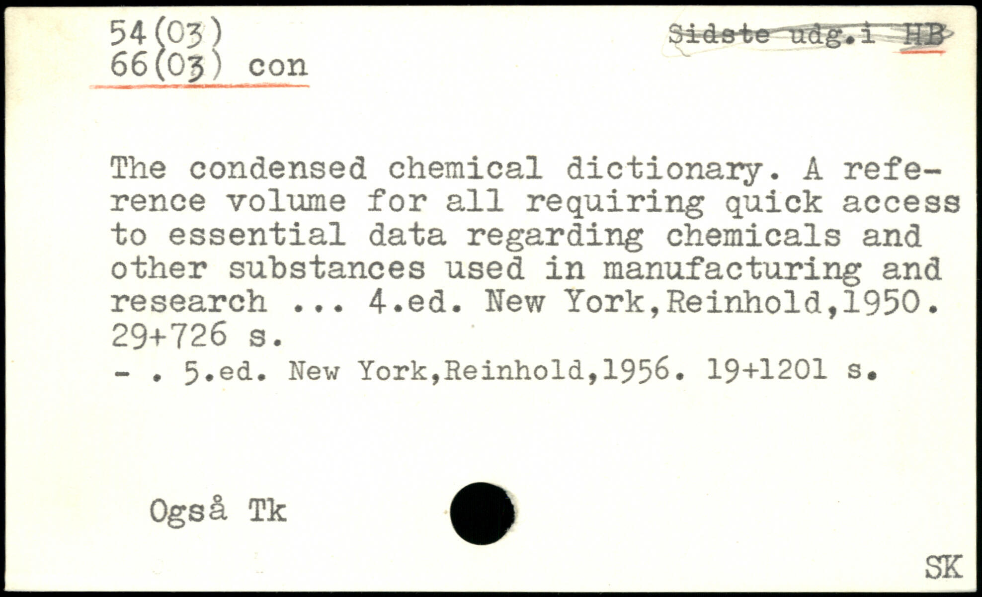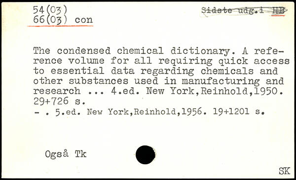 The condensed chemical dictionary. A reference volume for all requiring quick access to essential data regarding chemicals and other substances used in manufacturing and research ...