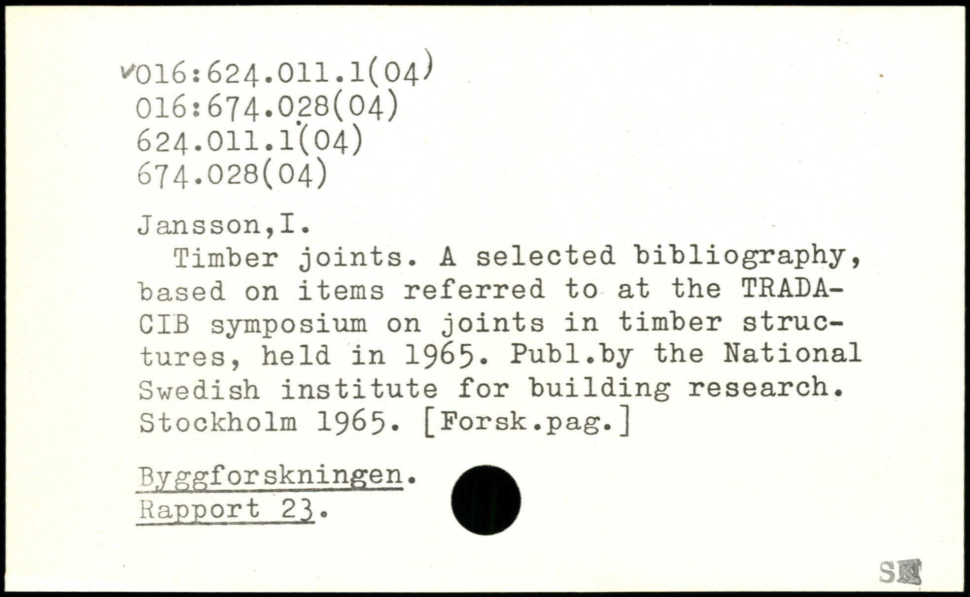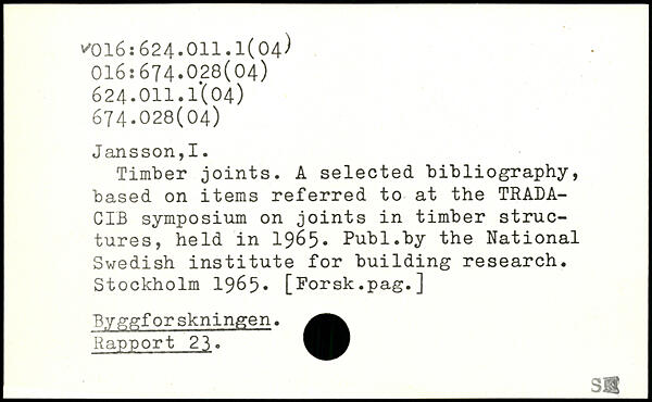 Timber joints. A selected bibliography, based on items referred to at the TRADA-CIB symposium on joints in timber structures, held in 1965.