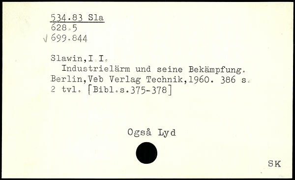 Industrielärm und seine Bekämpfung, Berlin,Veb Verlag Technik, 1960. 386 s, 2 tvl. [Bibi,s.375-378] Ogsä. Lyd