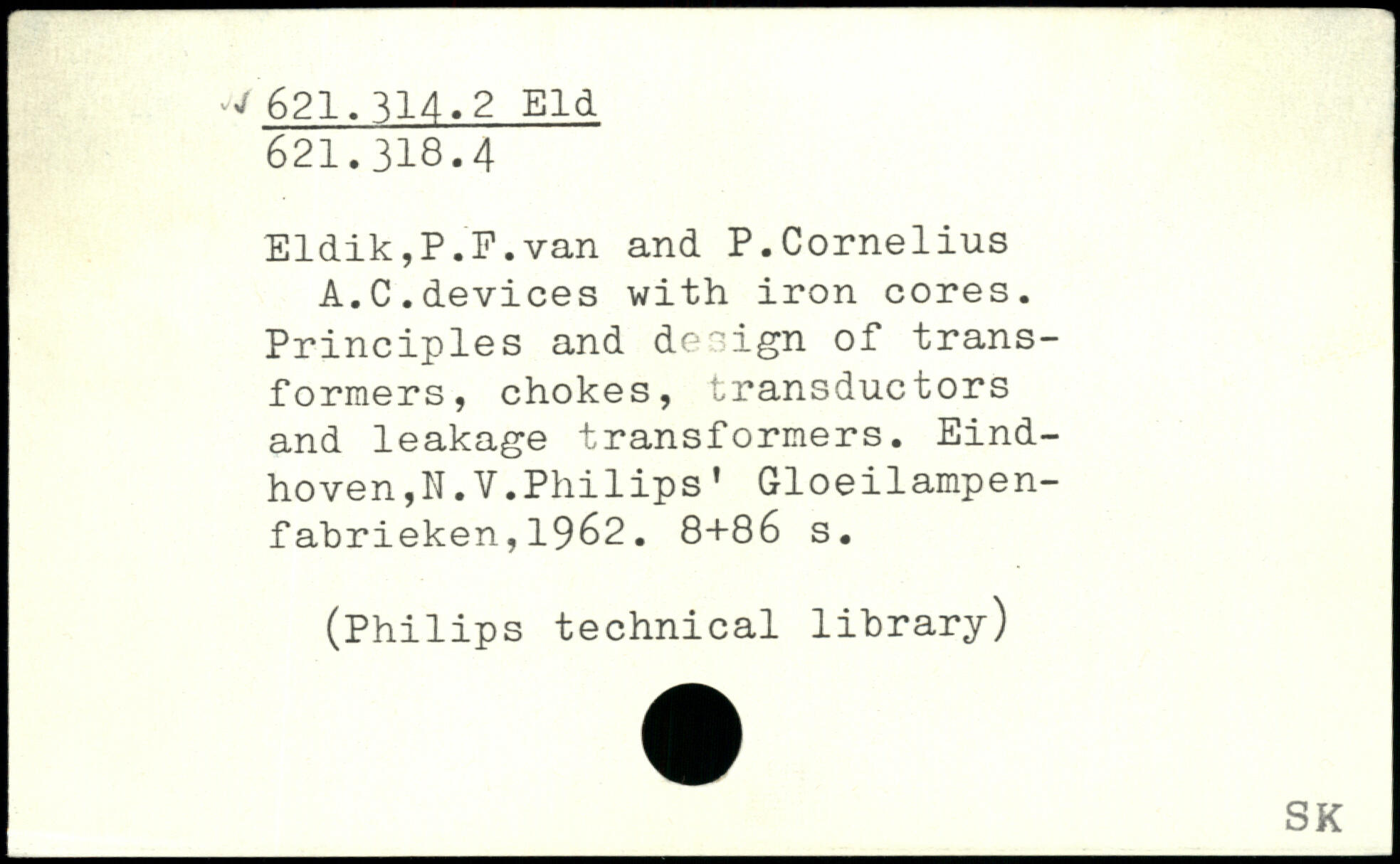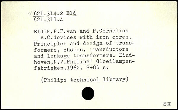 Eldik,P.F.van and P.Cornelius A.C.devices with iron cores. Principles and design of transformers, chokes, transductors and leakage transformers. Eindhoven ,N.V.Philips’ Gloeilampen-fahrieken,1962.