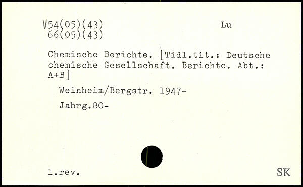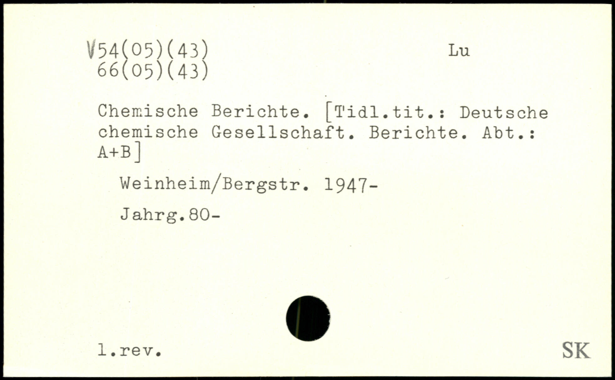 Chemische Berichte. [Tidl.tit.: Deutsche chemische Gesellschaft. Berichte. Abt.: Weinheim/Bergstr. 1947-Jahrg.80- 9 l.rev. SK