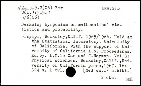Berkeley symposium on mathematical statistics and probability. 5.symp., Berkeley,Calif. 1965/1966. Held at the Statistical laboratory, University of California. With the support of University of California a.o. Proceedings. Ed.by. L.M.le Cam and J.Neyman.
