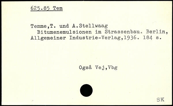 Bitumenemulsionen im Strassenbau, Berlin, Allgemeiner Industrie-Verlag,1936. 184 s. Ogsä Vej,Vbg