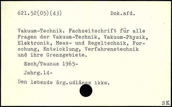 Vakuum-Technik. Fachzeitschrift für alle Fragen der Vakuum-Technik, Vakuum-Physik, Elektronik, Mess- und Regeltechnik, Forschung, Entwicklung, Verfahrenstechnik und ihre Grenzgebiete. Esch/Taunus 1965- Jahrg.14- Den lobende arg, udl^^^ ikke.
