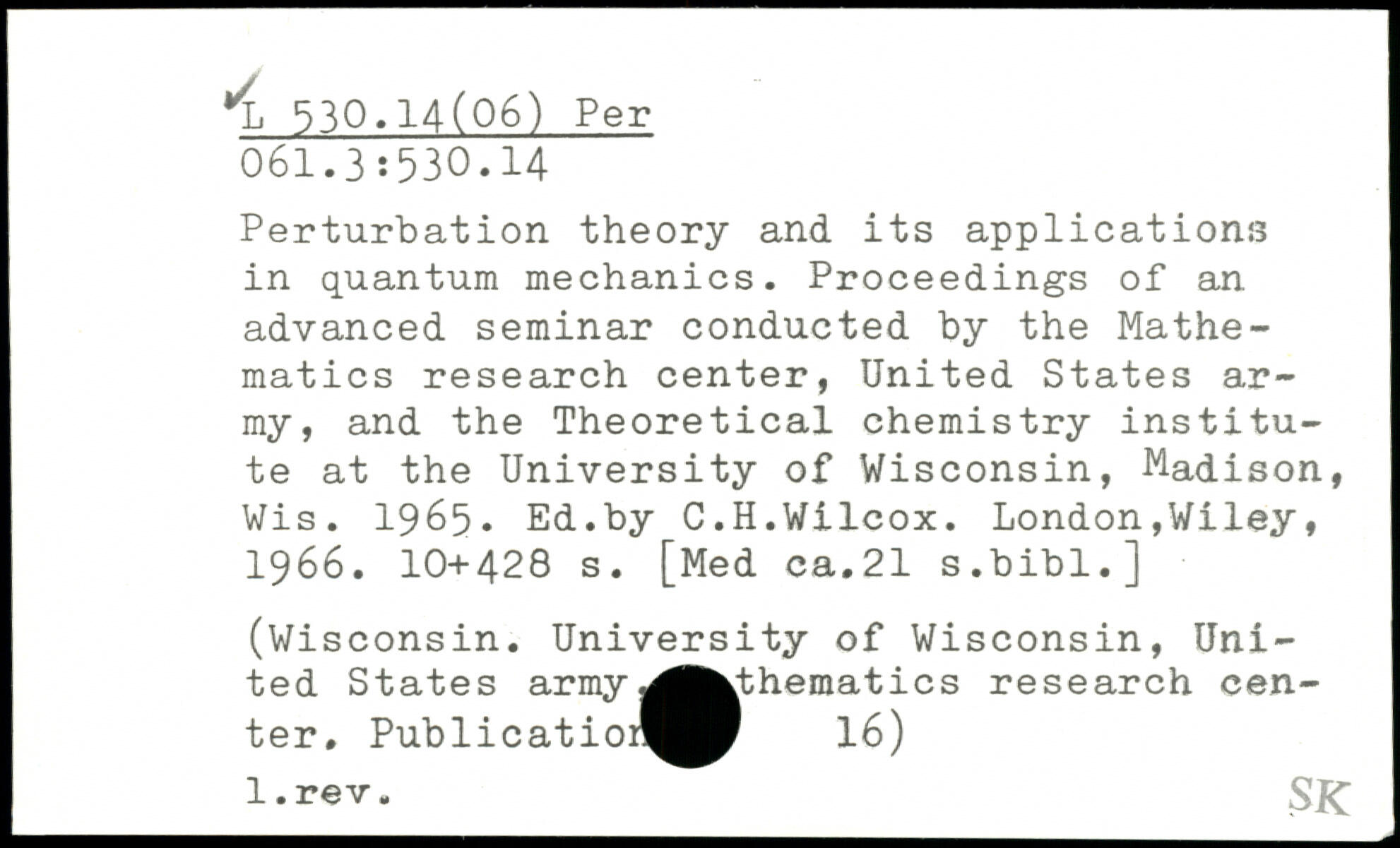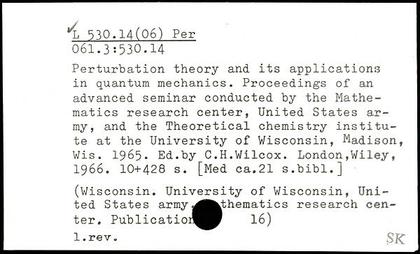 Perturbation theory and its applications in quantum mechanics. Proceedings of an advanced seminar conducted by the Mathematics research center, United States army, and the Theoretical chemistry institute at the University of Wisconsin, Madison, Wis. 1965. Ed.by C.H.Wilcox.