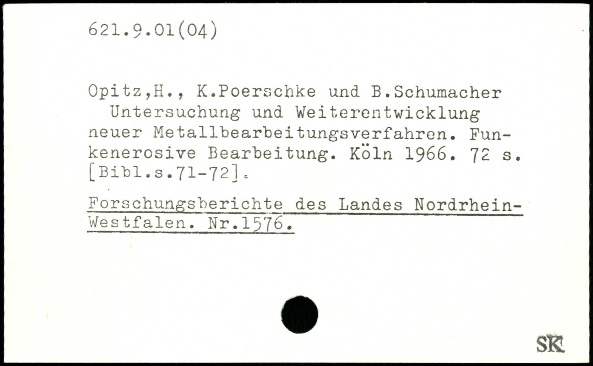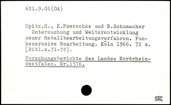 0pitz,H., K.Poerschke und B.Schumacher Untersuchung und Weiterentwicklung neuer Metallhearbeitungsverfahren. Fun-kenerosive Bearbeitung.