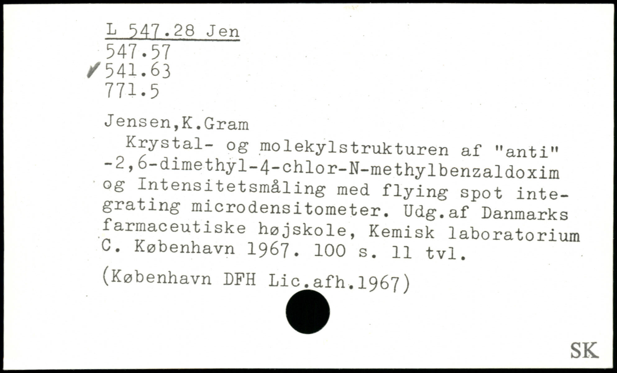 Jensen,K.Gram Krystal- og molekylstrukturen af "anti" -2, 6-dimethyl-4-chlor-N-methylbenzaldoxim og Intensitetsmåling med flying spot integrating microdensitometer. Udg.af Danmarks farmaceutiske højskole, Kemisk laboratorium C.