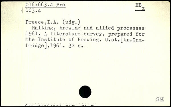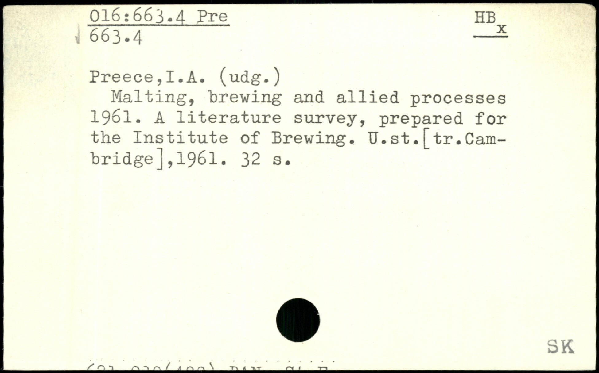 Malting, Brewing and allied processes 1961. A literature survey, prepared for the Institute of Brewing. U.st.[tr.Cambridge] ,1961.