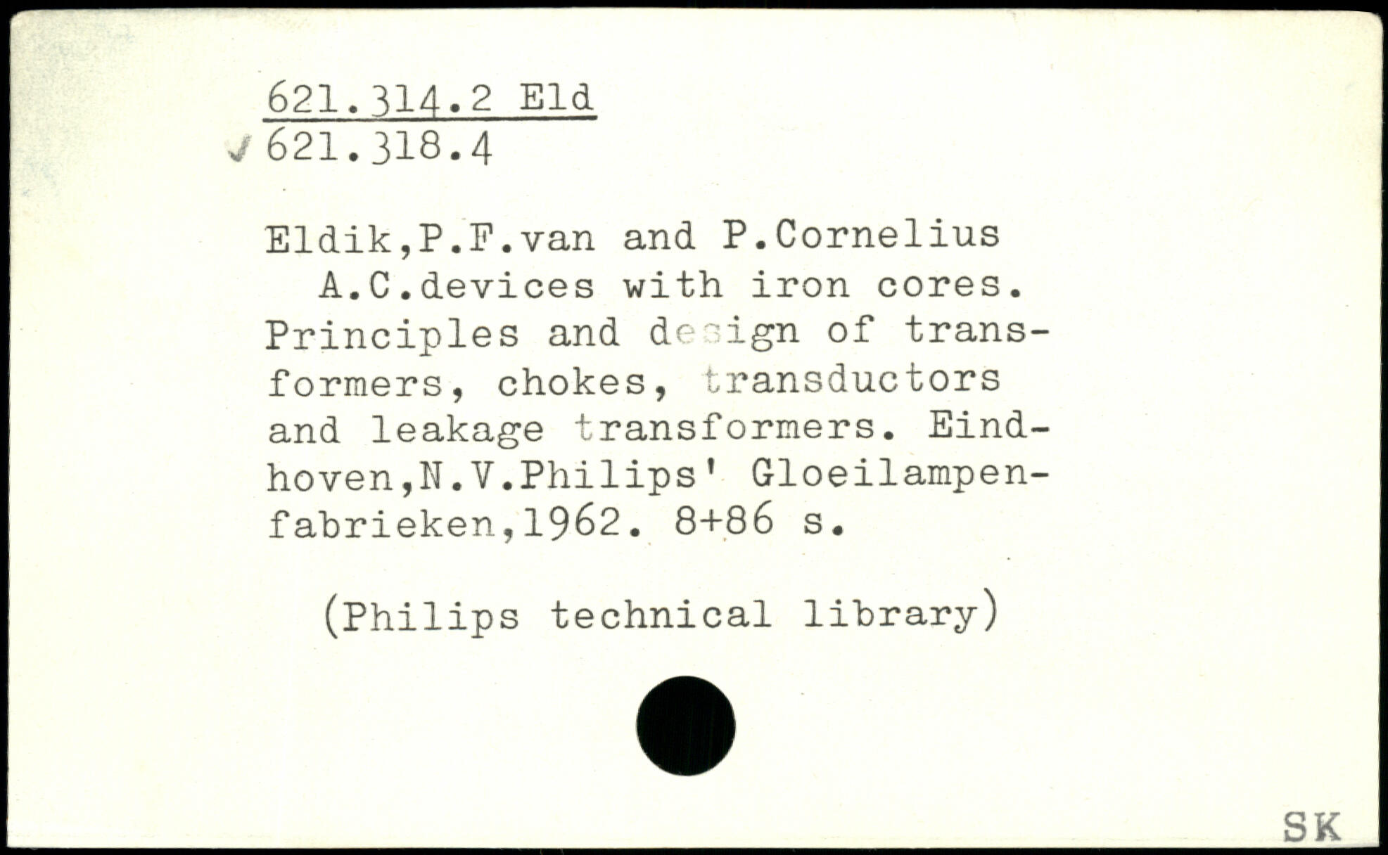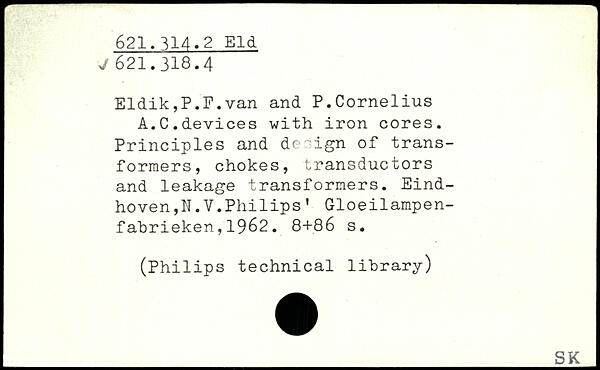 Eldik,P.F.van and P.Cornelius A.C.devices with iron cores. Principles and design of transformers, chokes, transductors and leakage transformers. Eindhoven, N.V.Philips' Gloeilampen-fahrieken,1962.