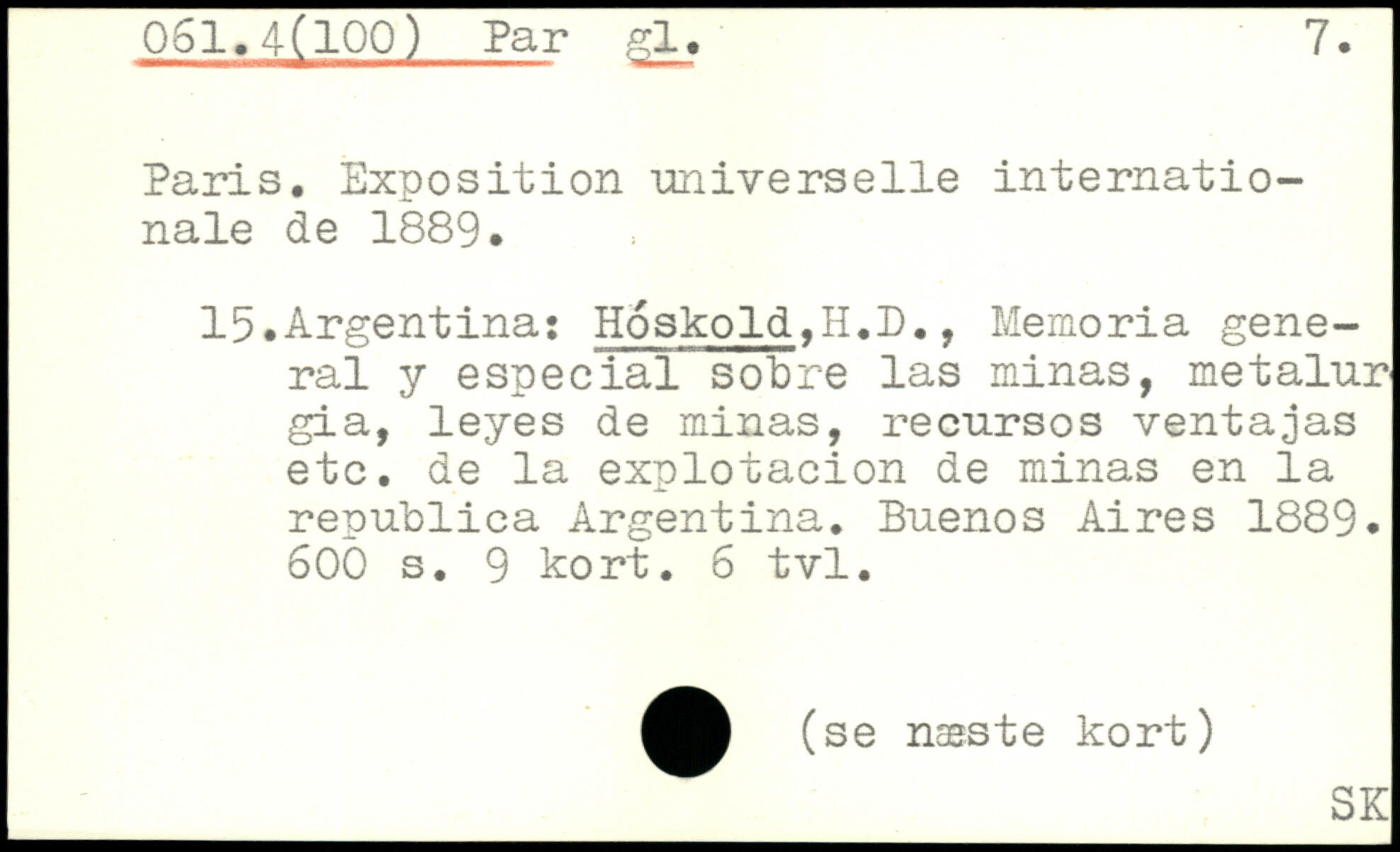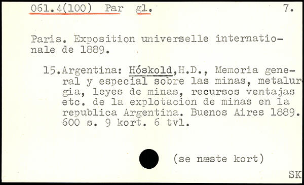 Paris. Exposition universelle internationale de 1889. 15.Argentina: Hoskold>H.D., Memoria general y especial sobre las minas, metalur gia, leyes de minas, recursos ventajas etc. de la explotacion de minas en la republica Argentina. Buenos Aires 1889.