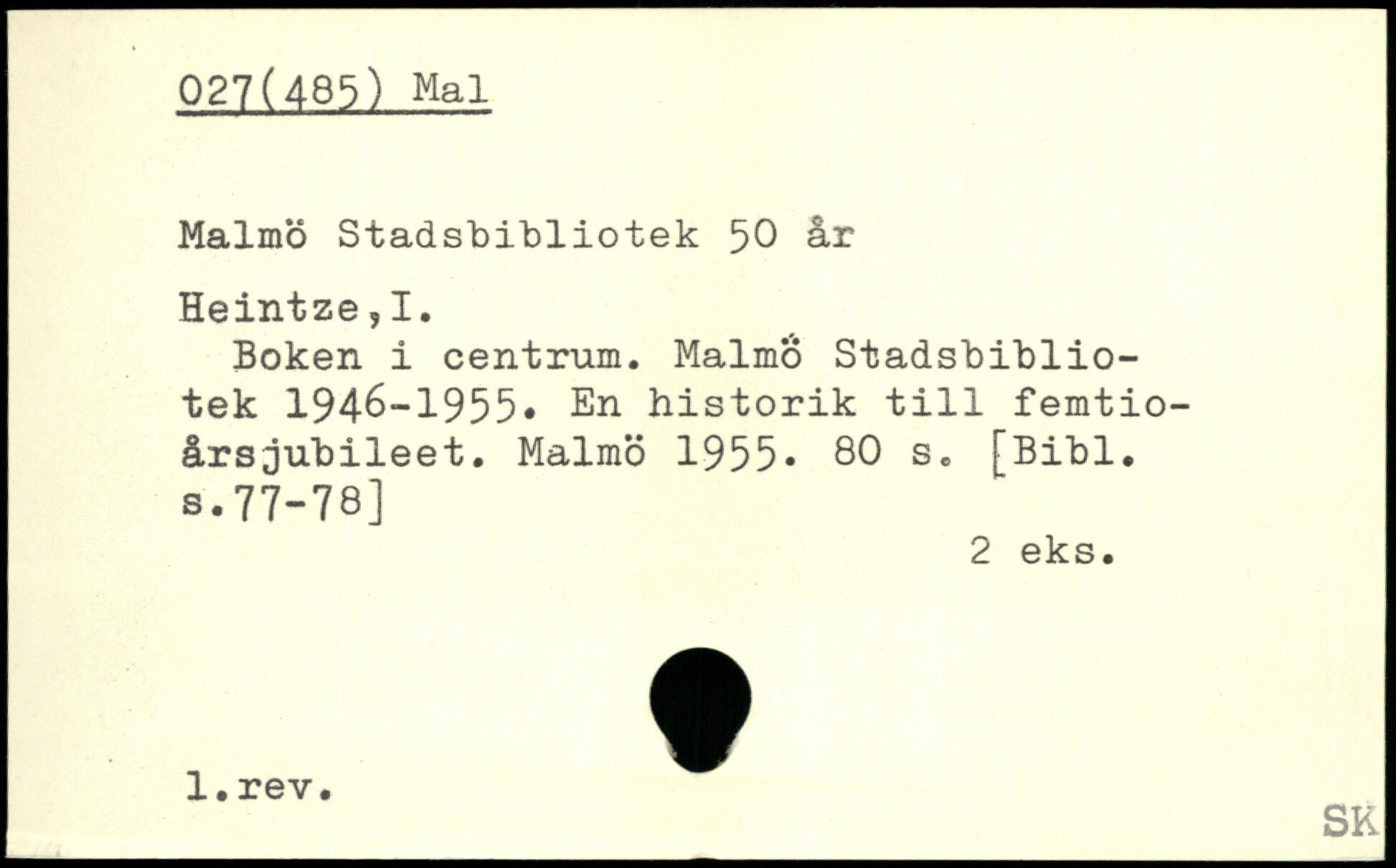 Malmö Stadsbibliotek 50 år Heintze,I. Boken i centrum. Malmö Stadsbibliotek 1946-1955, En historik till femtioårsjubileet. Malmö 1955.