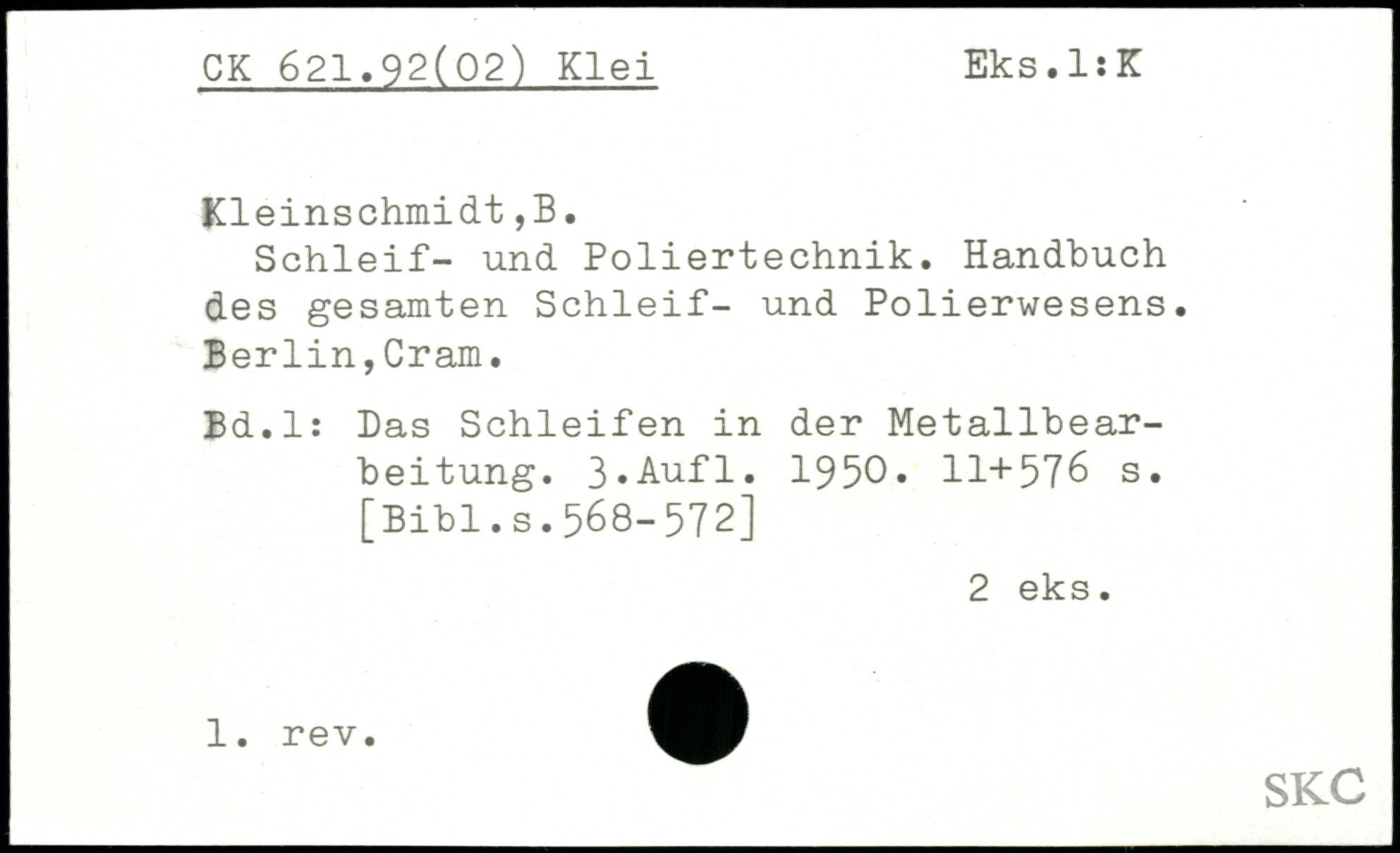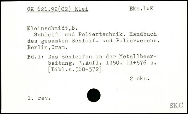 Schleif- und Poliertechnik. Handbuch des gesamten Schleif- und Polierwesens. Berlin,Cram. Bd.l: Das Schleifen in der Metallbearbeitung.