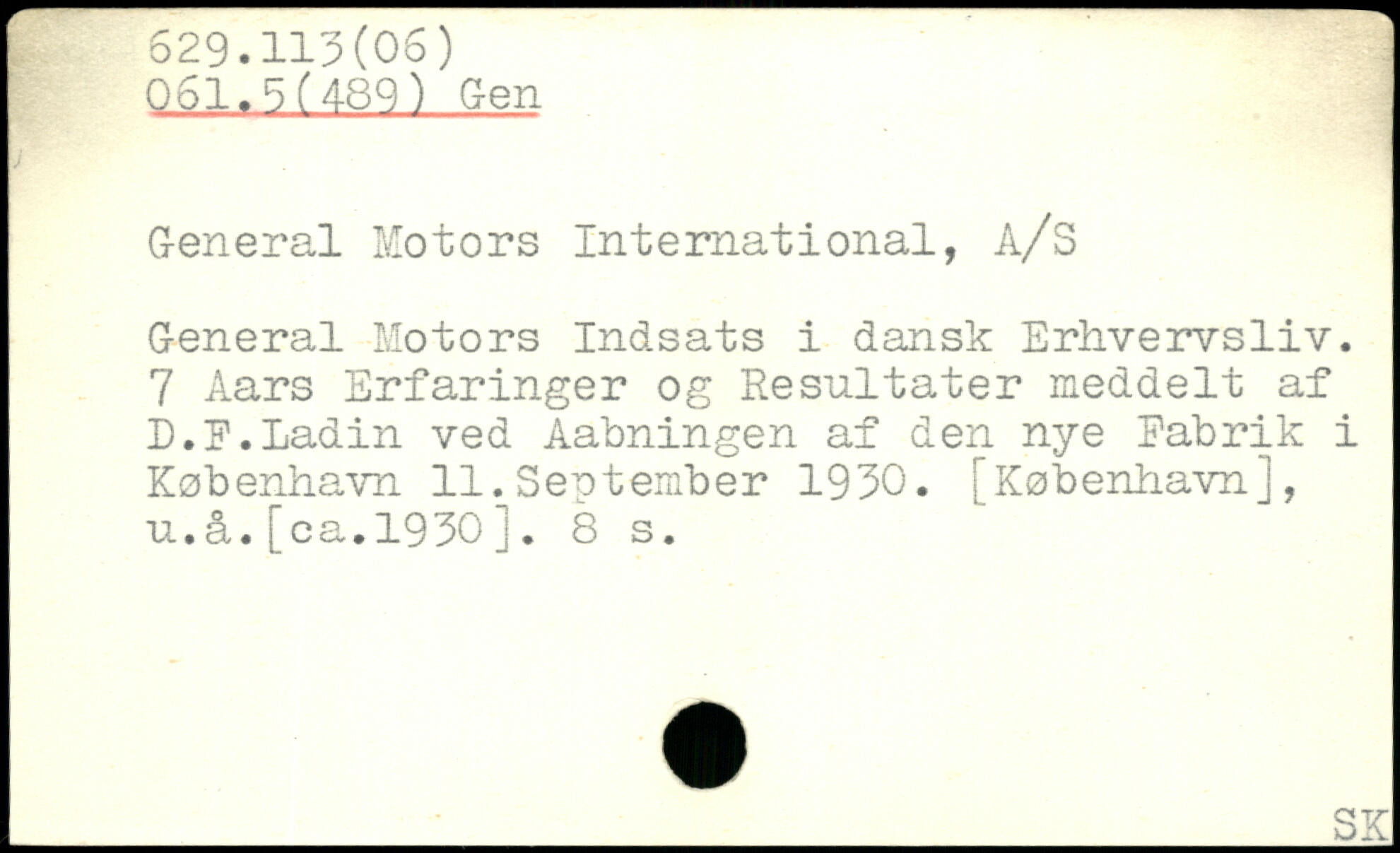 General Motors International, A/S General Motors Indsats i dansk Erhvervsliv. 7 Aars Erfaringer og Resultater meddelt af D.E.Ladin ved Aabningen af den nye Eabrik i København 11.September 1930. [København], u.å.[ca.1930].