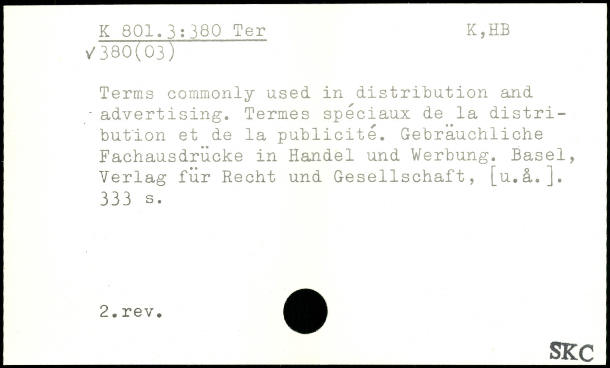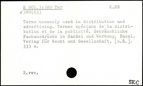 Terms commonly used in distribution and. advertising. Termes spéciaux de la distribution et de la publicité. Gebräuchliche Fachausdrücke in Handel und Werbung. Basel, Verlag für Recht und Gesellschaft, [u.ä.].