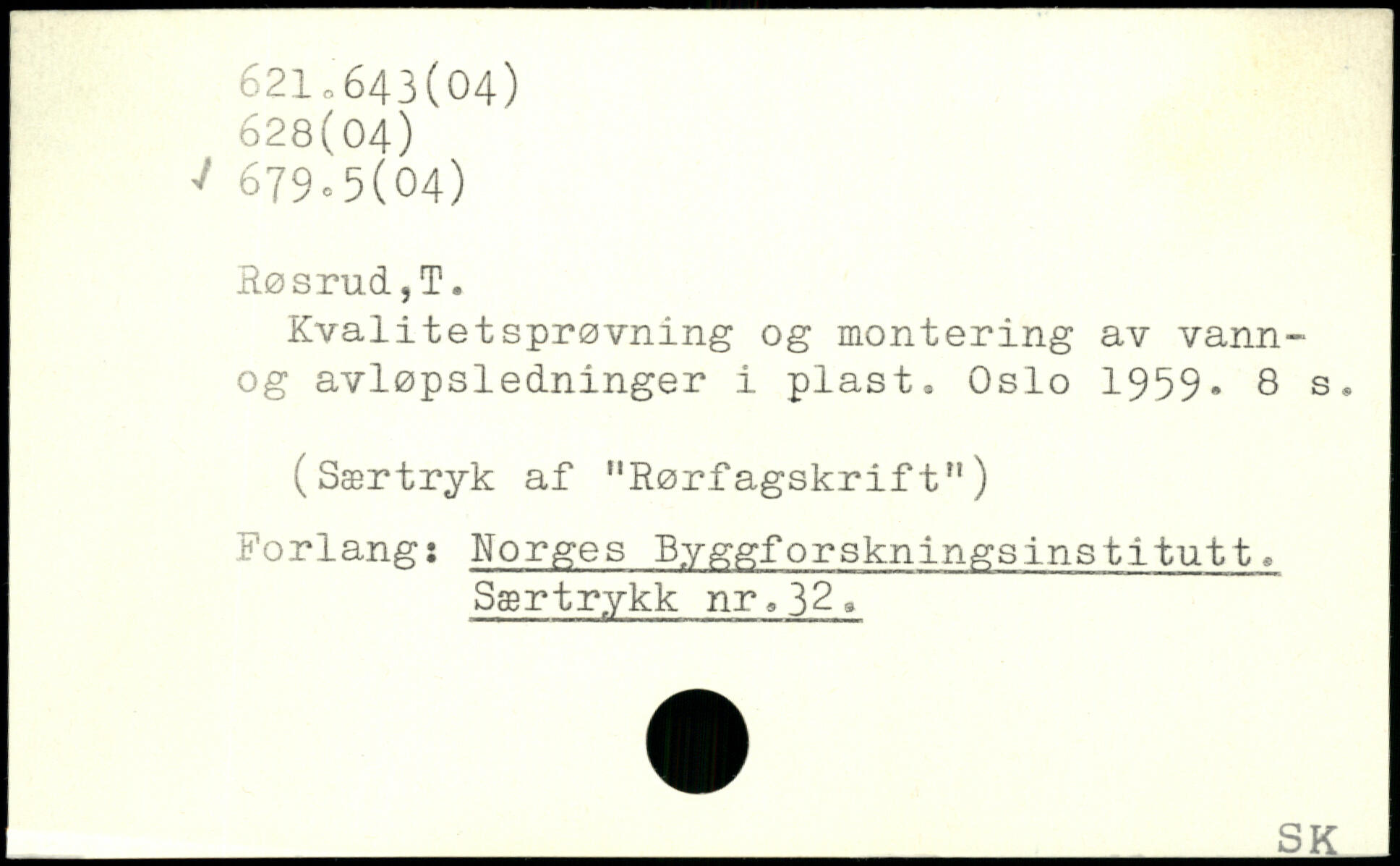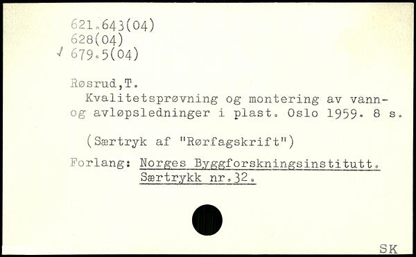 Kvalitetsprøvning og montering av vann~ og avløpsledninger i plast. Oslo 1959.