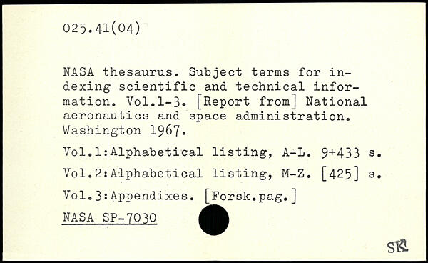 NASA thesaurus. Subject terms for indexing scientific and technical information.