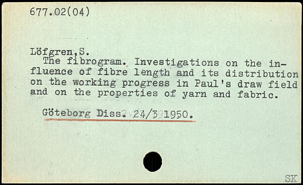 The fibrogram. Investigations on the influence of fibre length and its distribution on the working progress in Paul’s draw field and on the properties of yarn and fabric. Gdteborg Biss. 24/3 1950.