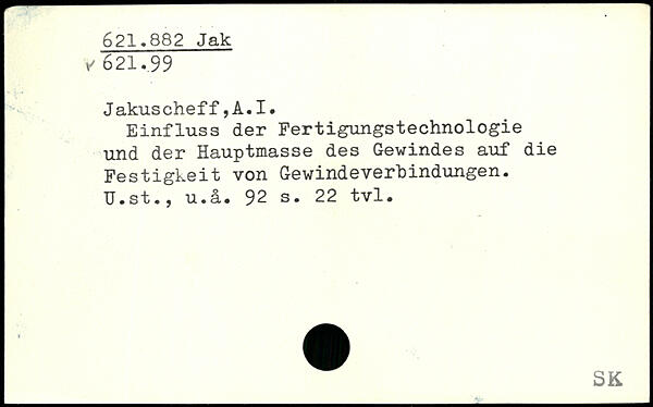 J akus chef f,A.I. Einfluss der Fertigungstechnologie und der Hauptmasse des Gewindes auf die Festigkeit von Gewindeverhindungen. TJ.st., u.ä.