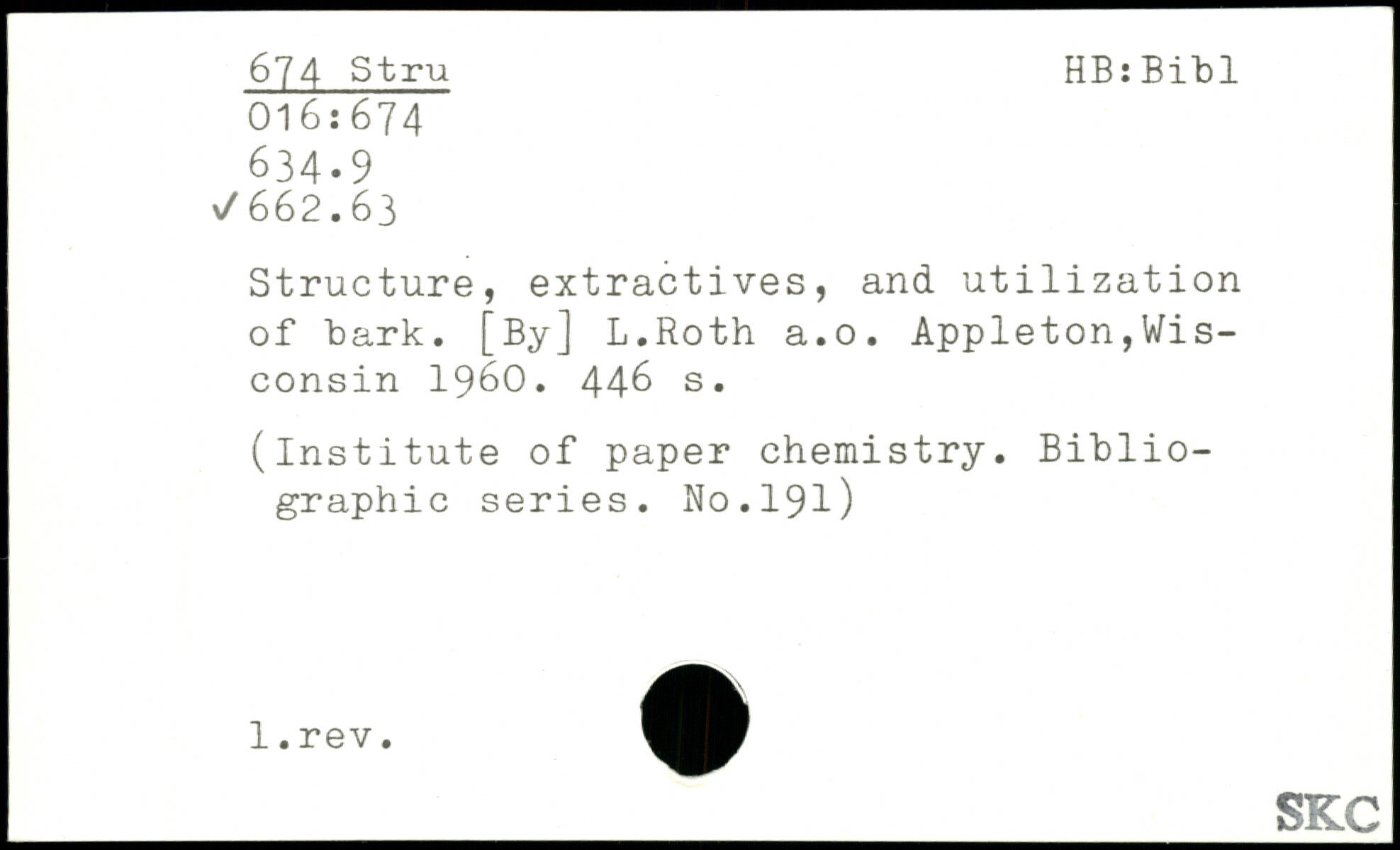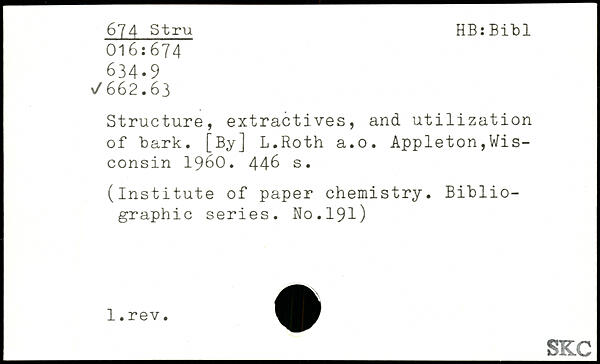 Structure, extractives, and utilization of bark. [By] L.Roth a.o. Appleton,Wisconsin 1960.