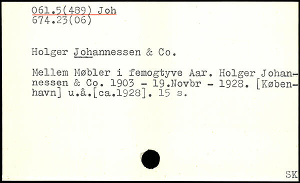 Holger Johannessen & Co. Mellem Møbler i femogtyve Aar. Holger^Johan-nessen & Co. 1903 - 19.Hovbr - 1928. [København] u.å.[ca.1928].